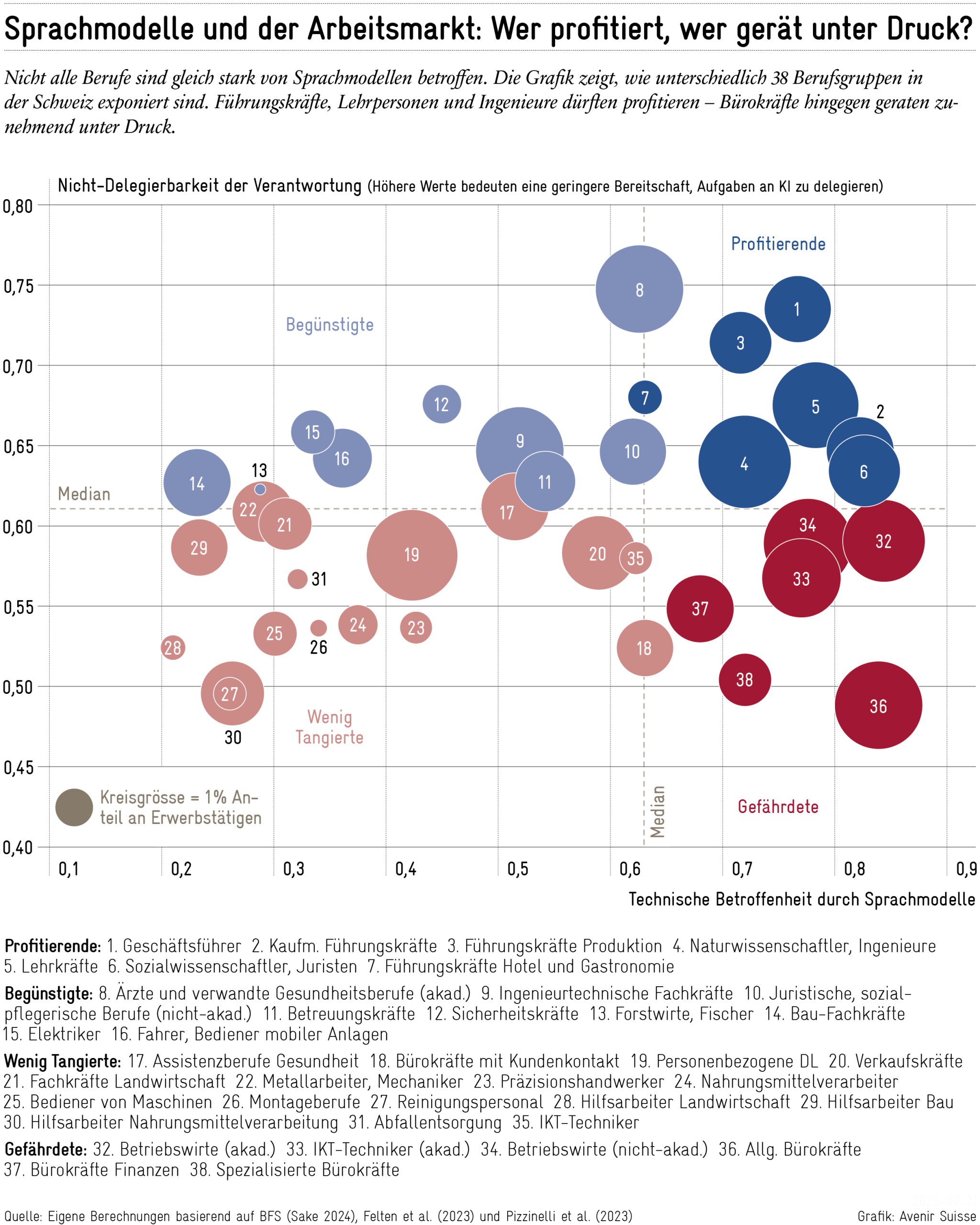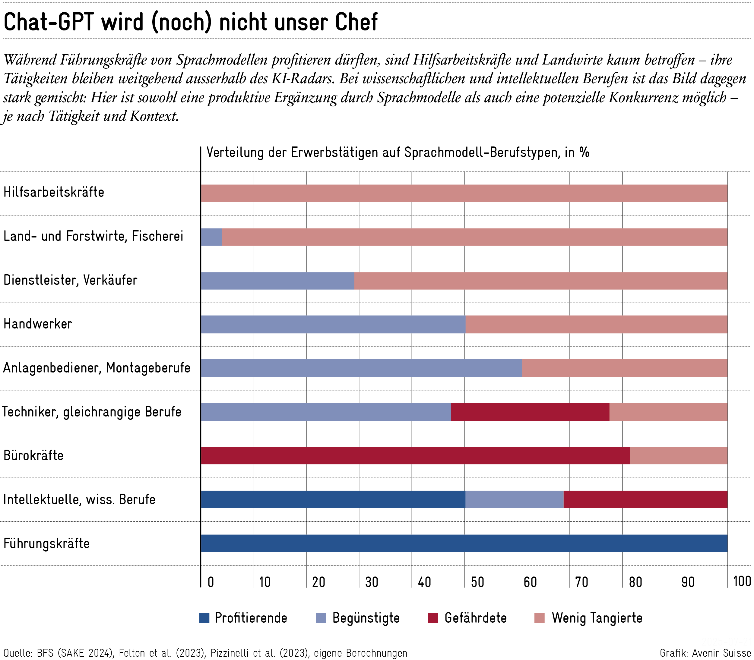 Die Vorgehensweise orientiert sich an der Avenir-Suisse-Studie «Zukunftssichere Berufe?», in der Marco Salvi und Patrick Schnell erstmals versucht haben, die potenziellen Auswirkungen von Künstlicher Intelligenz auf den Schweizer Arbeitsmarkt systematisch zu erfassen.